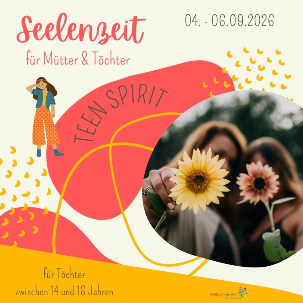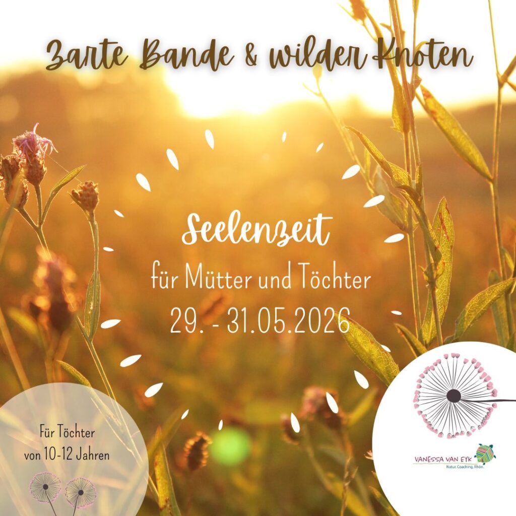 Verwoben, verwirrt, verstrickt und verbunden – eine Seelenzeit für Mütter und ihre jugendlichen Töchter. Die Töchter – suchend, rebellisch, zornig, strahlend. Die Mütter – fragend, regelnd, wehmütig, liebend. Dazwischen viele Töne, Farben, Stimmungen, Wünsche und Träume. Eine bewegte Zeit für unser Beziehungsband. Wir schenken uns ein gemeinsames Wochenende, schöpfen aus unserem Vollen und schauen, welche Spur wir gegangen und welche Richtung wir nehmen möchten.